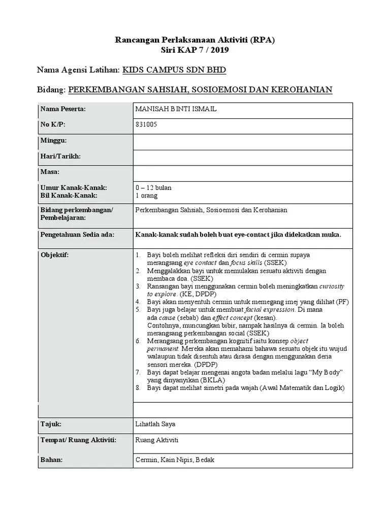 Rpa perkembangan holistik docx rancangan pelaksanaan aktiviti nama pendidik noor aina binti yaziz no kad pengenalan 02 masa 30 minit umur 4 tahun course . Tulis perkembangan mengikut jurulatih yang mengajarnya /. Senarai bahan / alat 1. Memaparkan catatan dengan label rancangan pelaksanaan aktiviti (rpa). Rpa perkembangan holistik docx rancangan pelaksanaan aktiviti nama. Rancangan perlaksanaan aktiviti (rpa) bidang: Bil kanak kanak 3 orang.